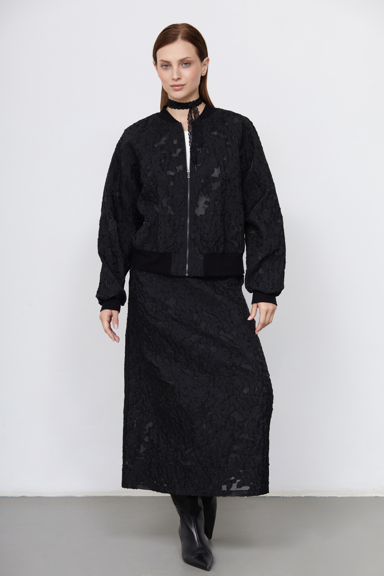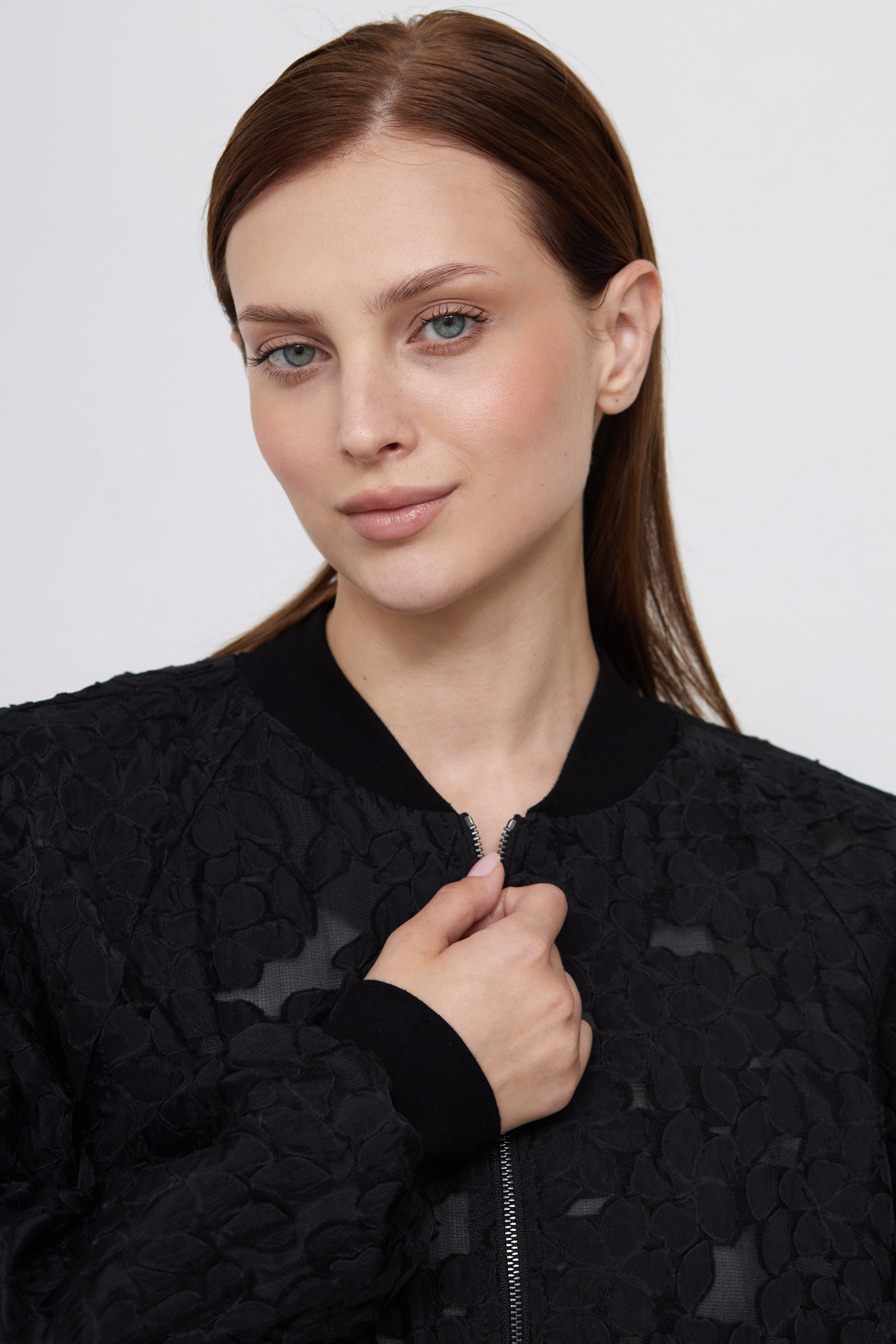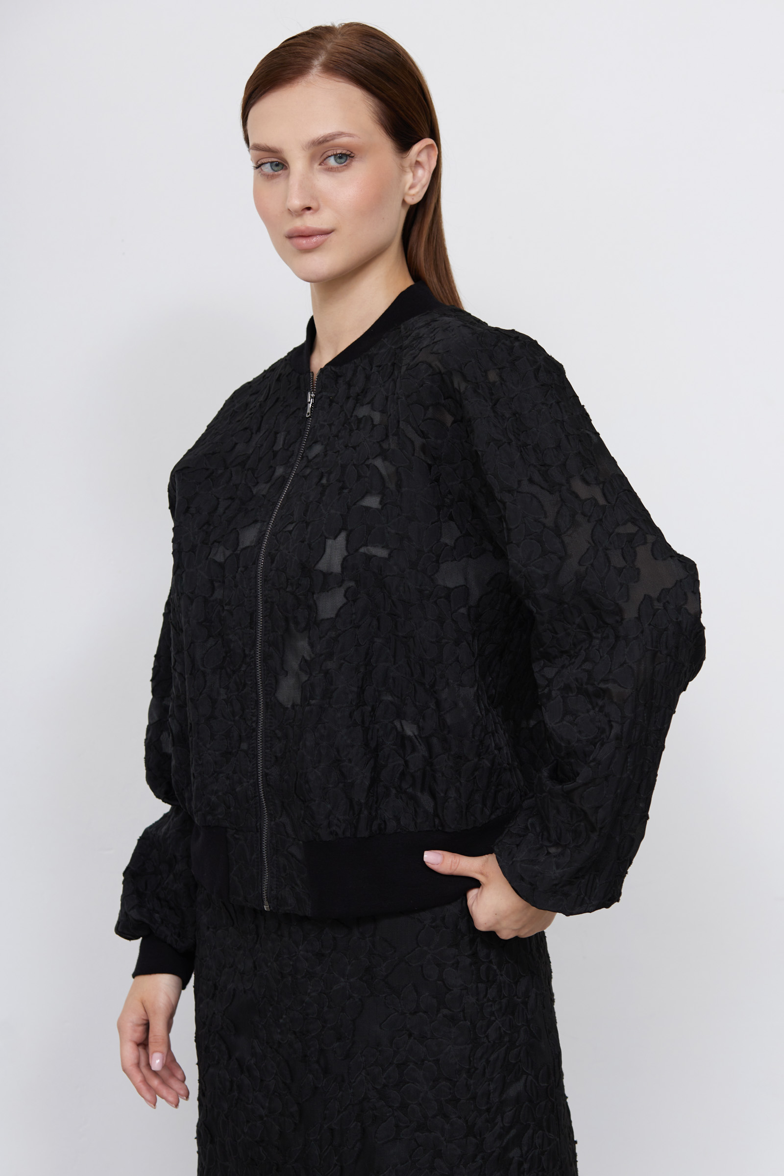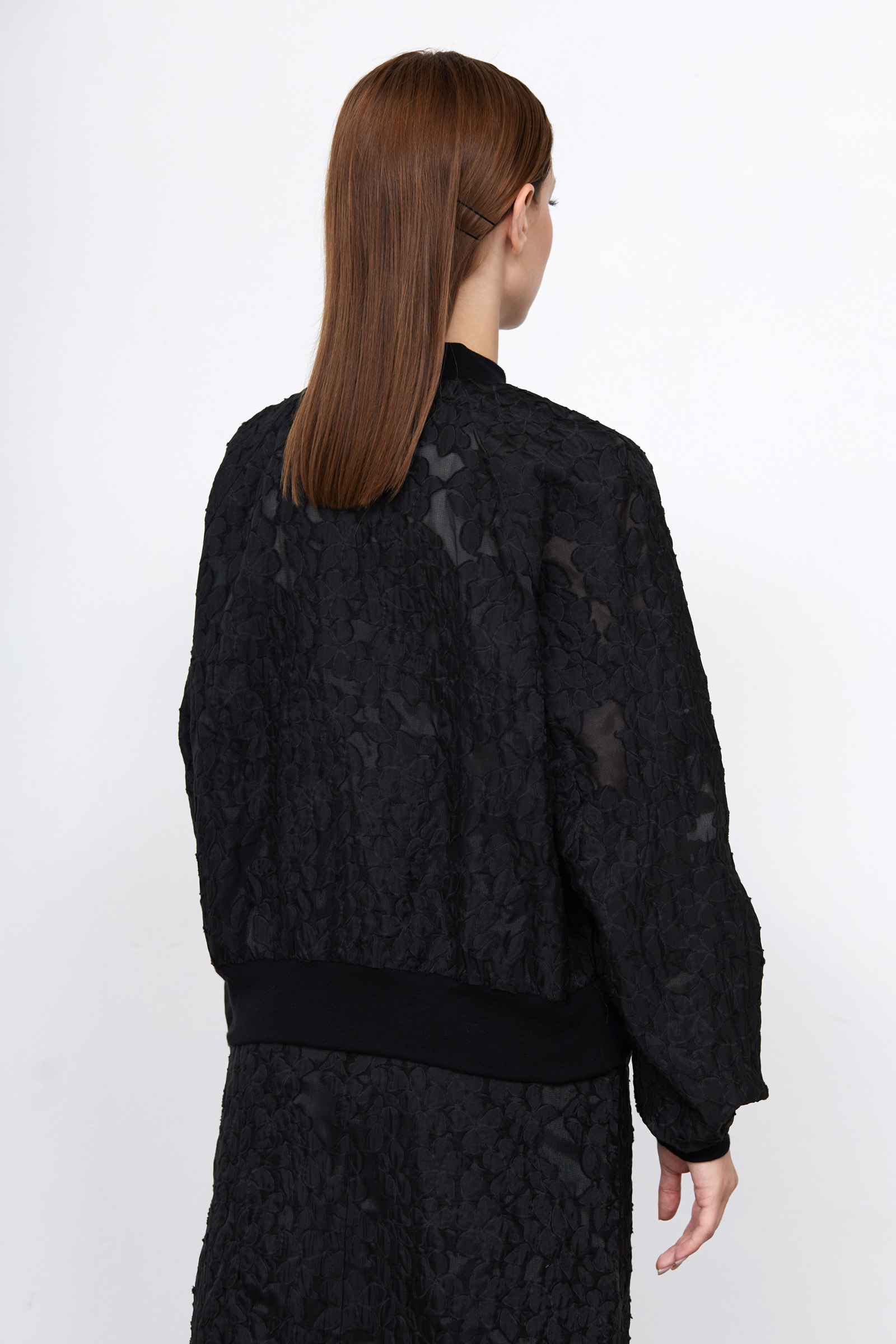 Куртка-бомбер из органзы с цветочной аппликацией.