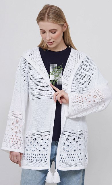 Удлиненный кардиган oversize ажурной вязки с капюшоном и декором.