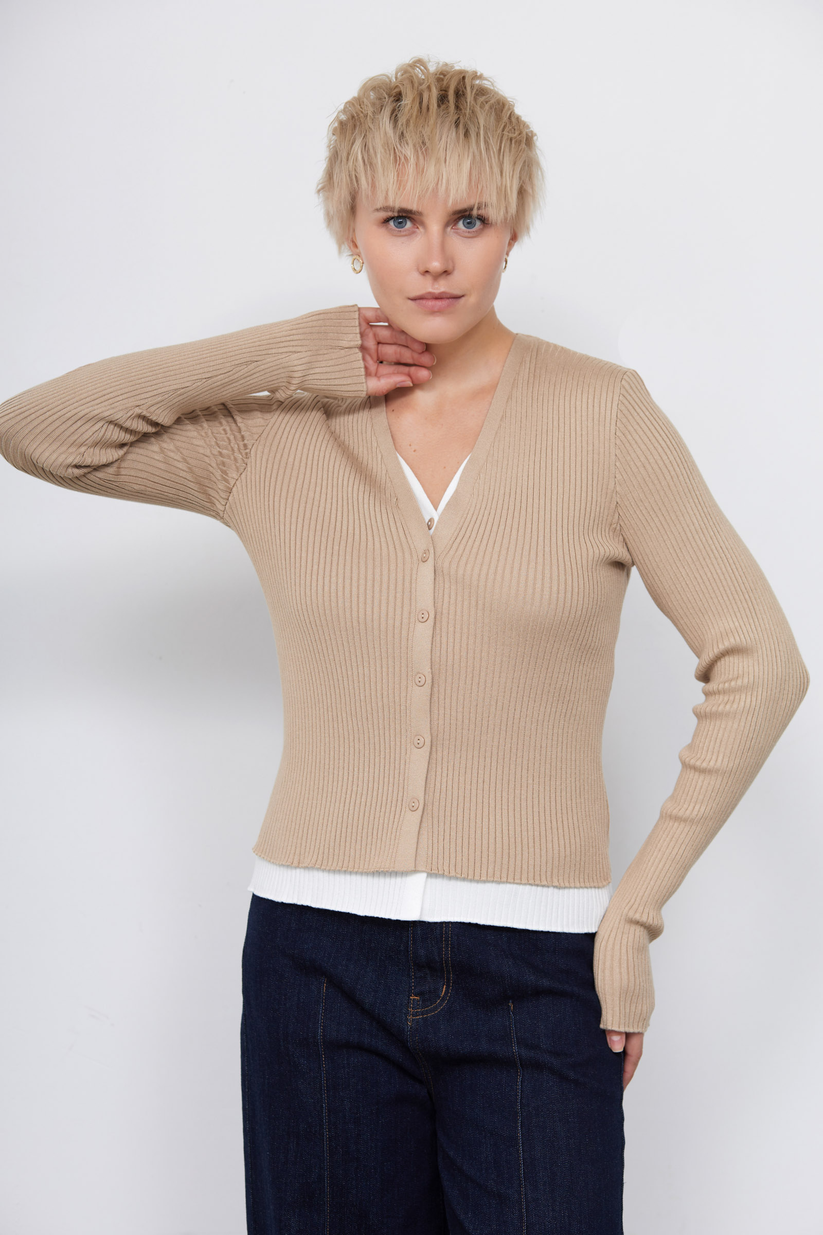 Двуслойный облегающий кардиган из мягкого вискозного трикотажа в рубчик.