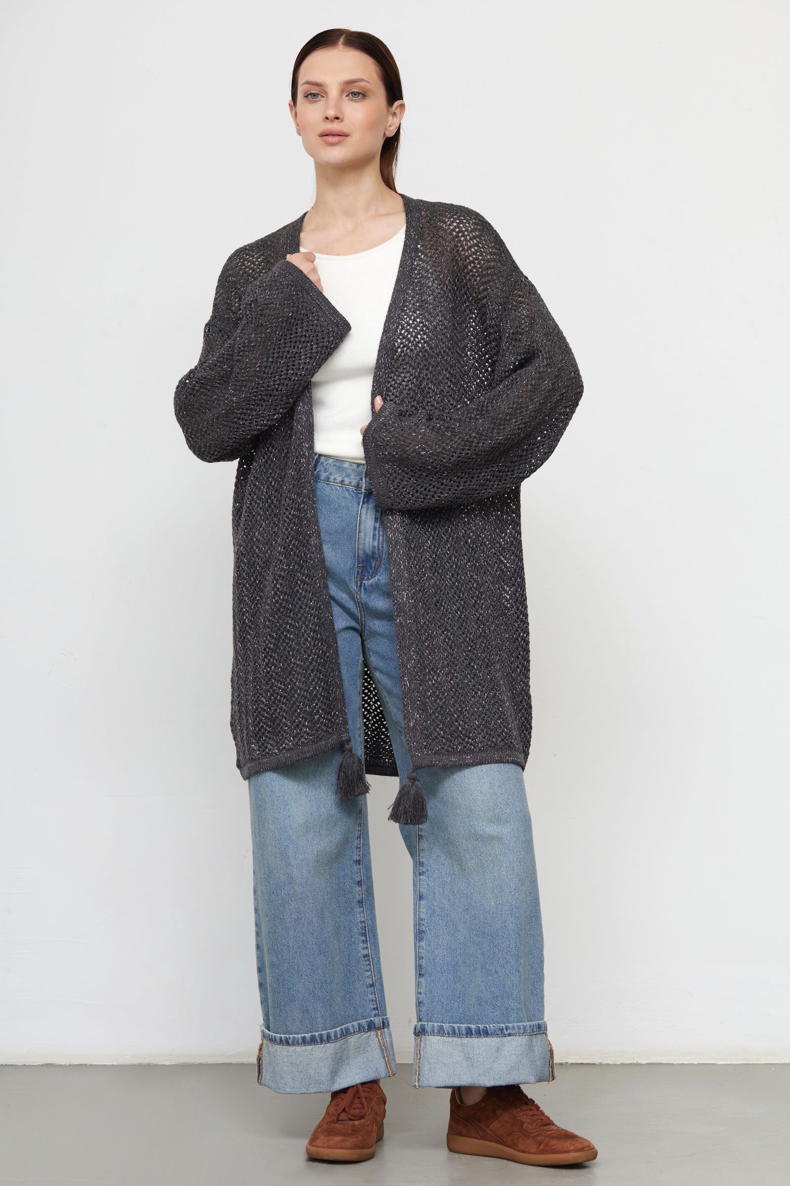 Удлиненный кардиган oversize из смесовой шерсти ажурной вязки с люрексом и декором.