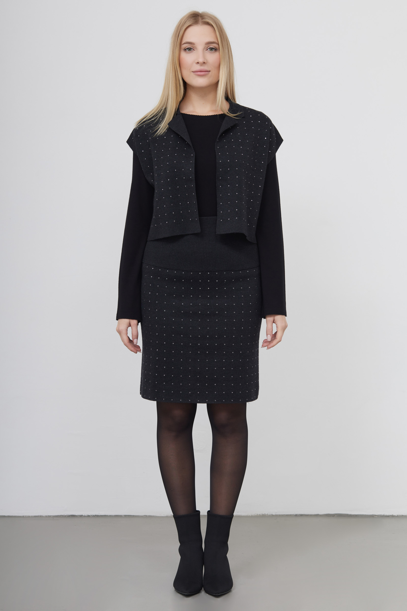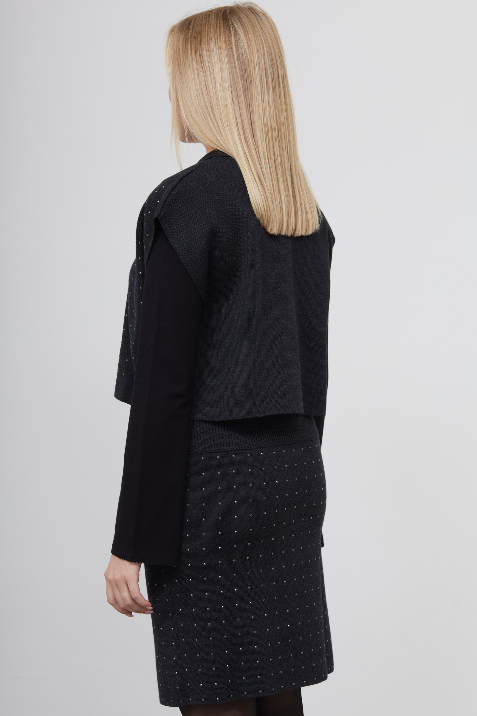 Укороченный полушерстяной жилет, декорированный стразами по переду.