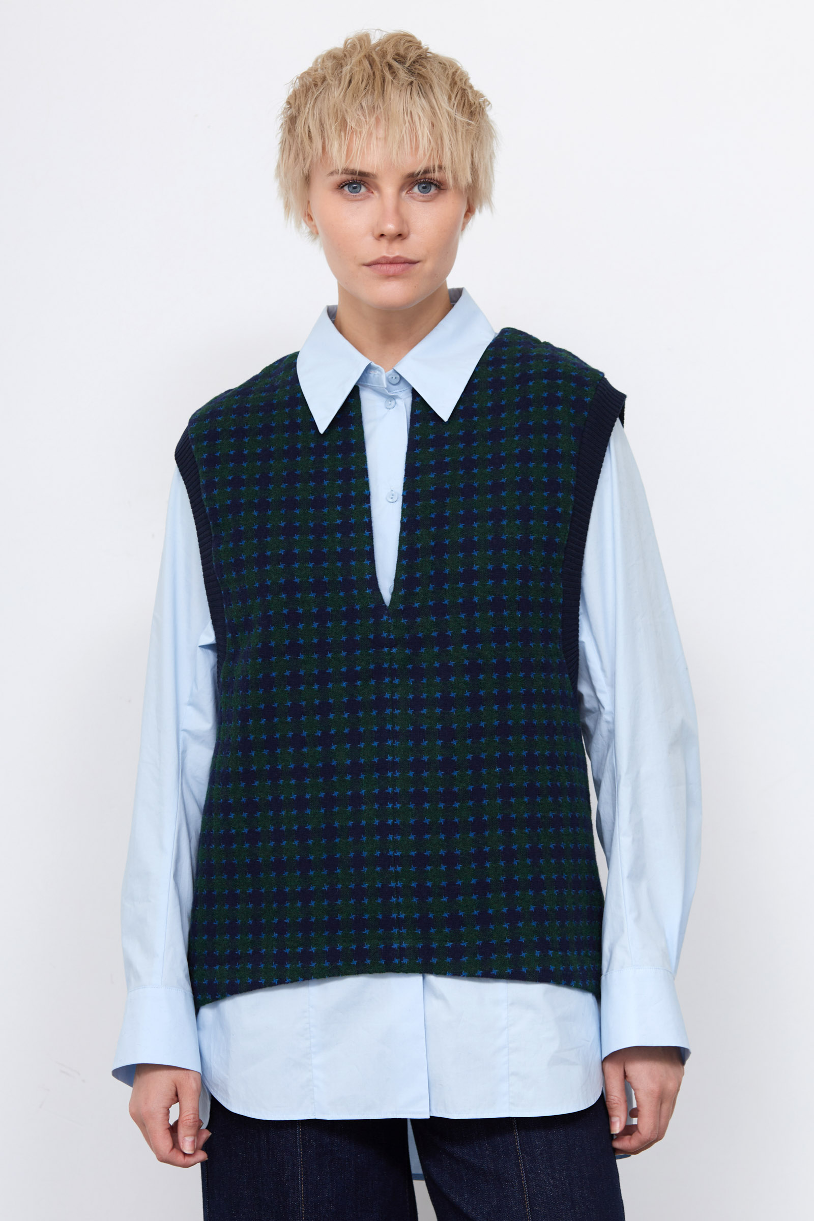 Полушерстяной жилет oversize с контрастным принтом и широкими проймами.