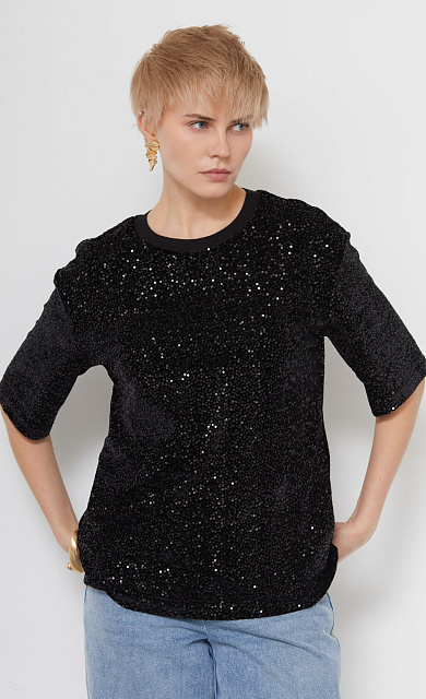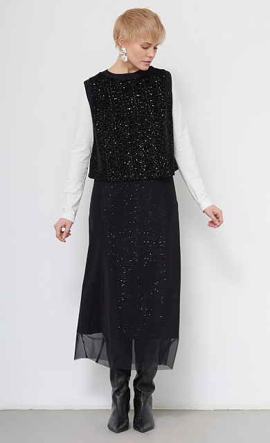 Укороченный жилет oversize из бархата с пайетками и трикотажной отделкой.