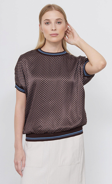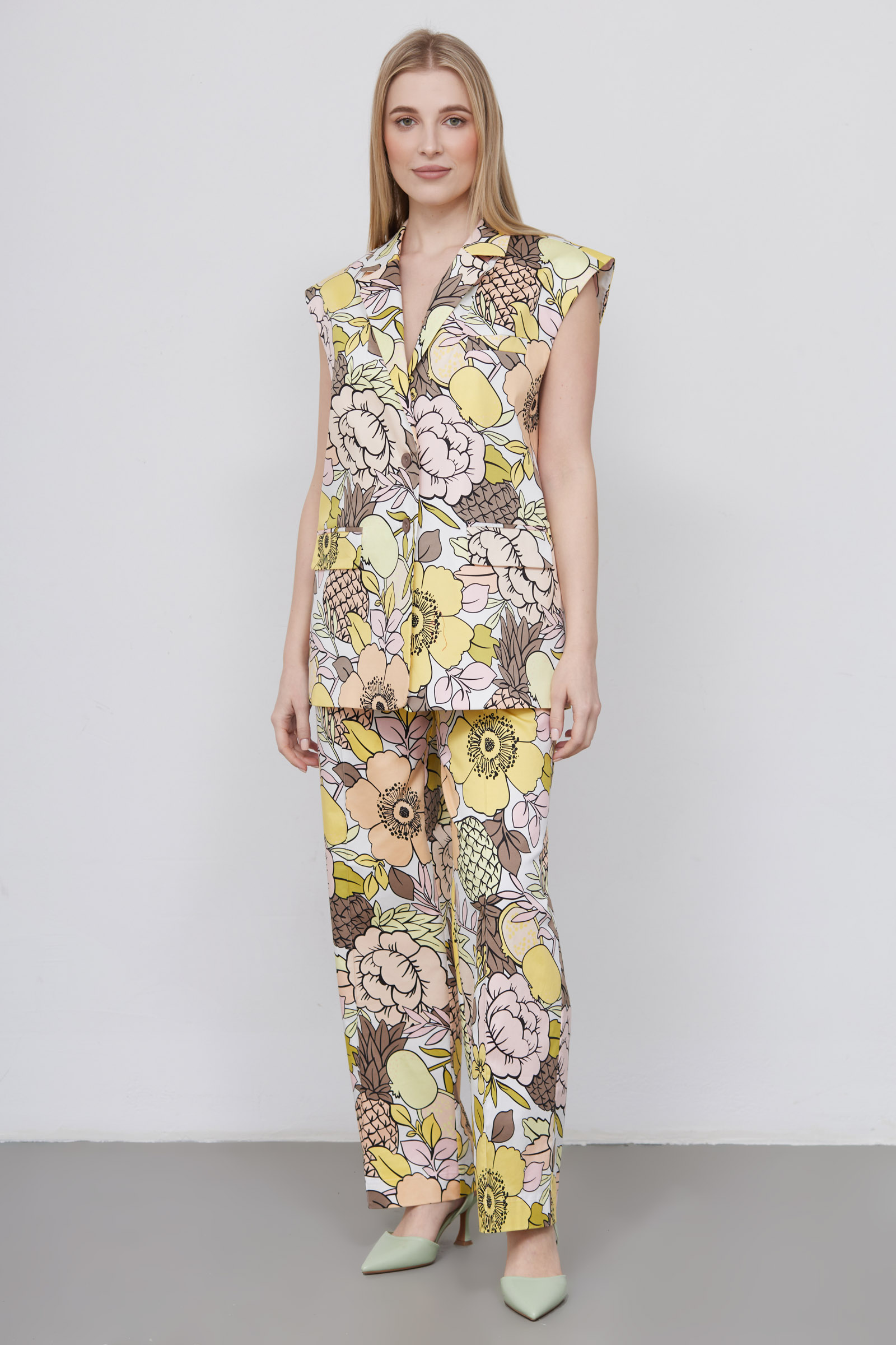 Костюмный жилет oversize из эластичного хлопка с ярким контрастныи принтом и английским воротником.