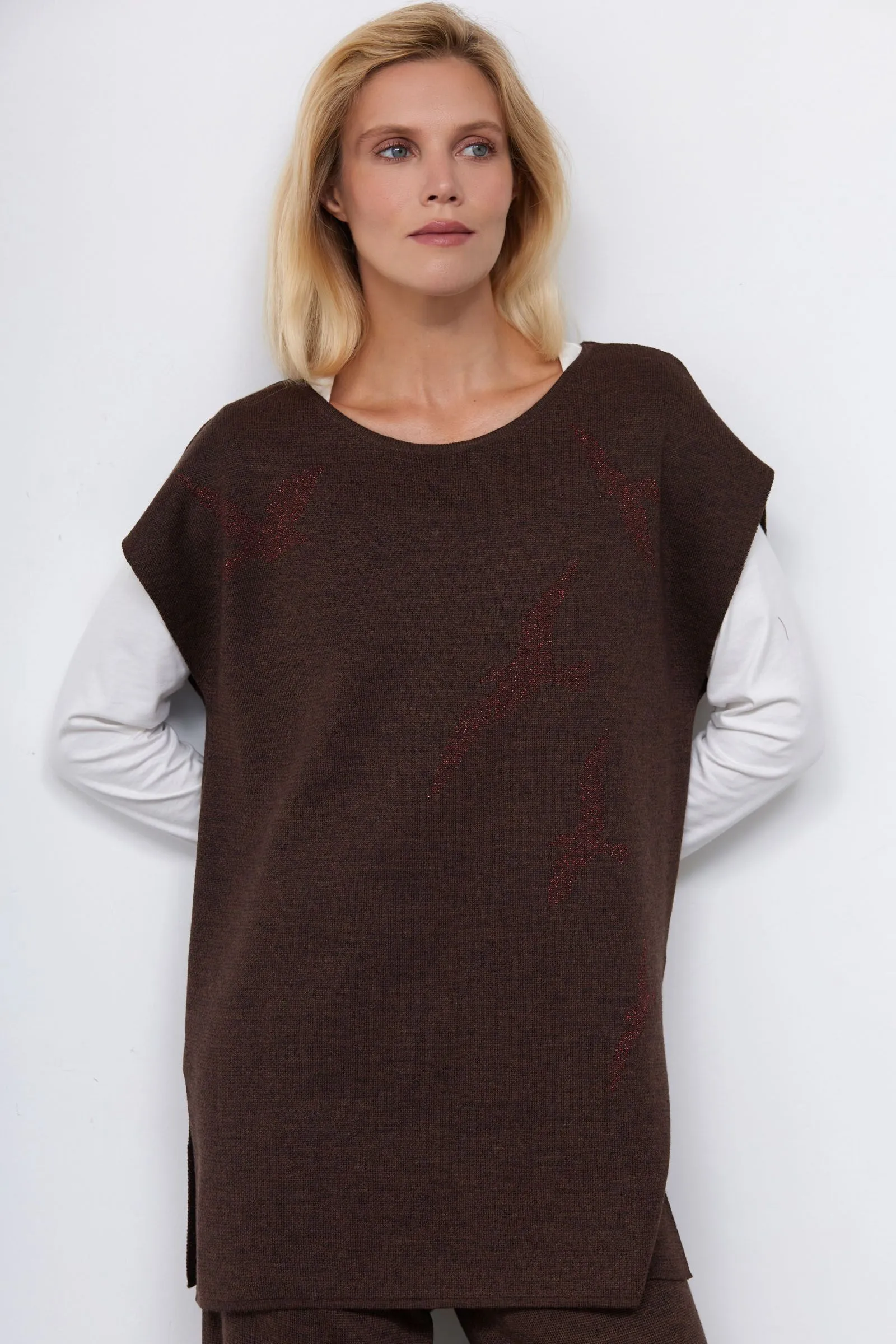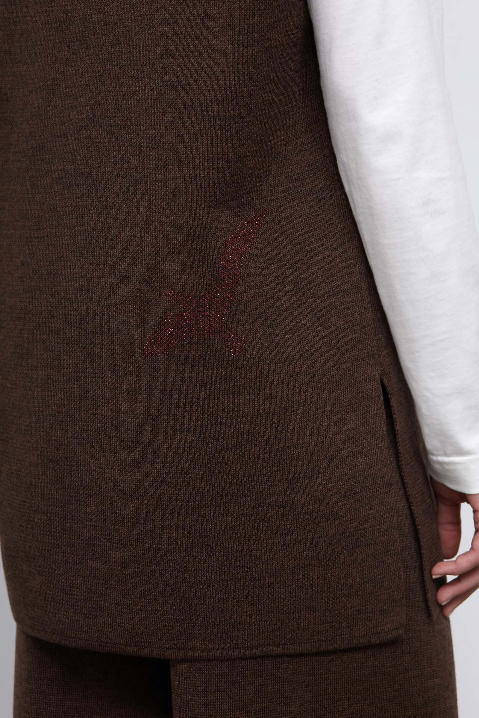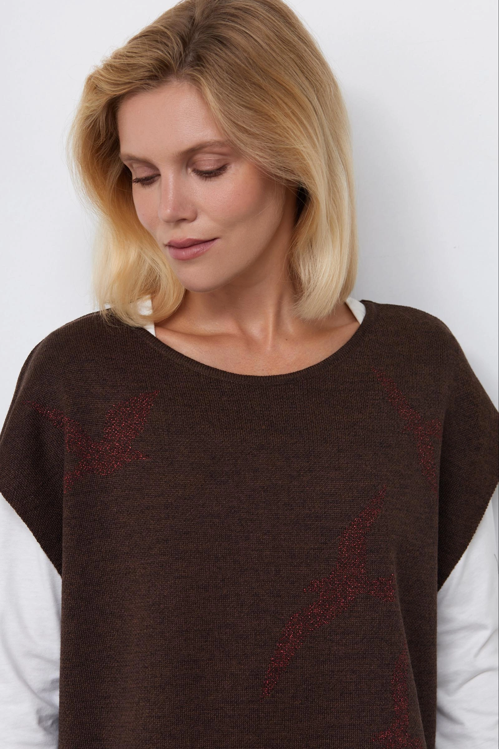 Полушерстяной вязаный жилет с рисунком из люрекса.