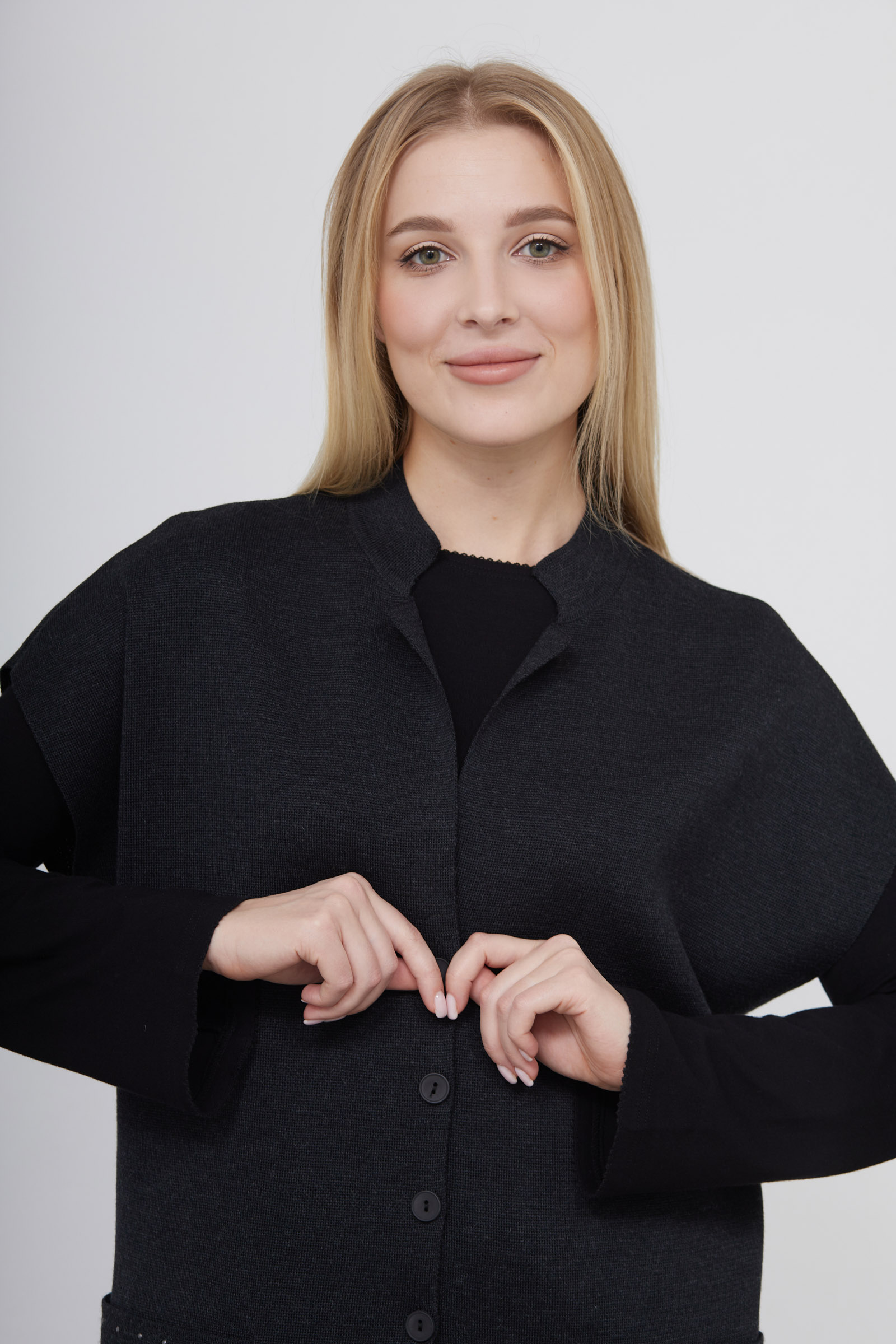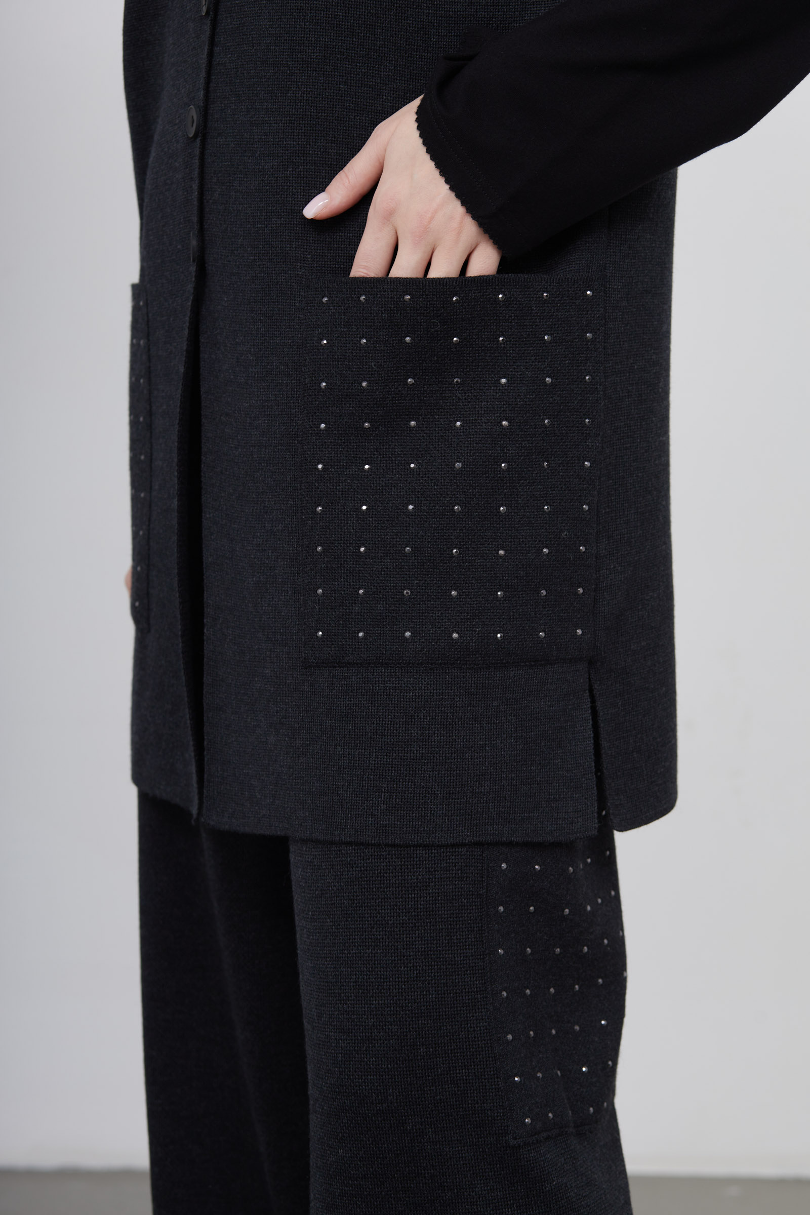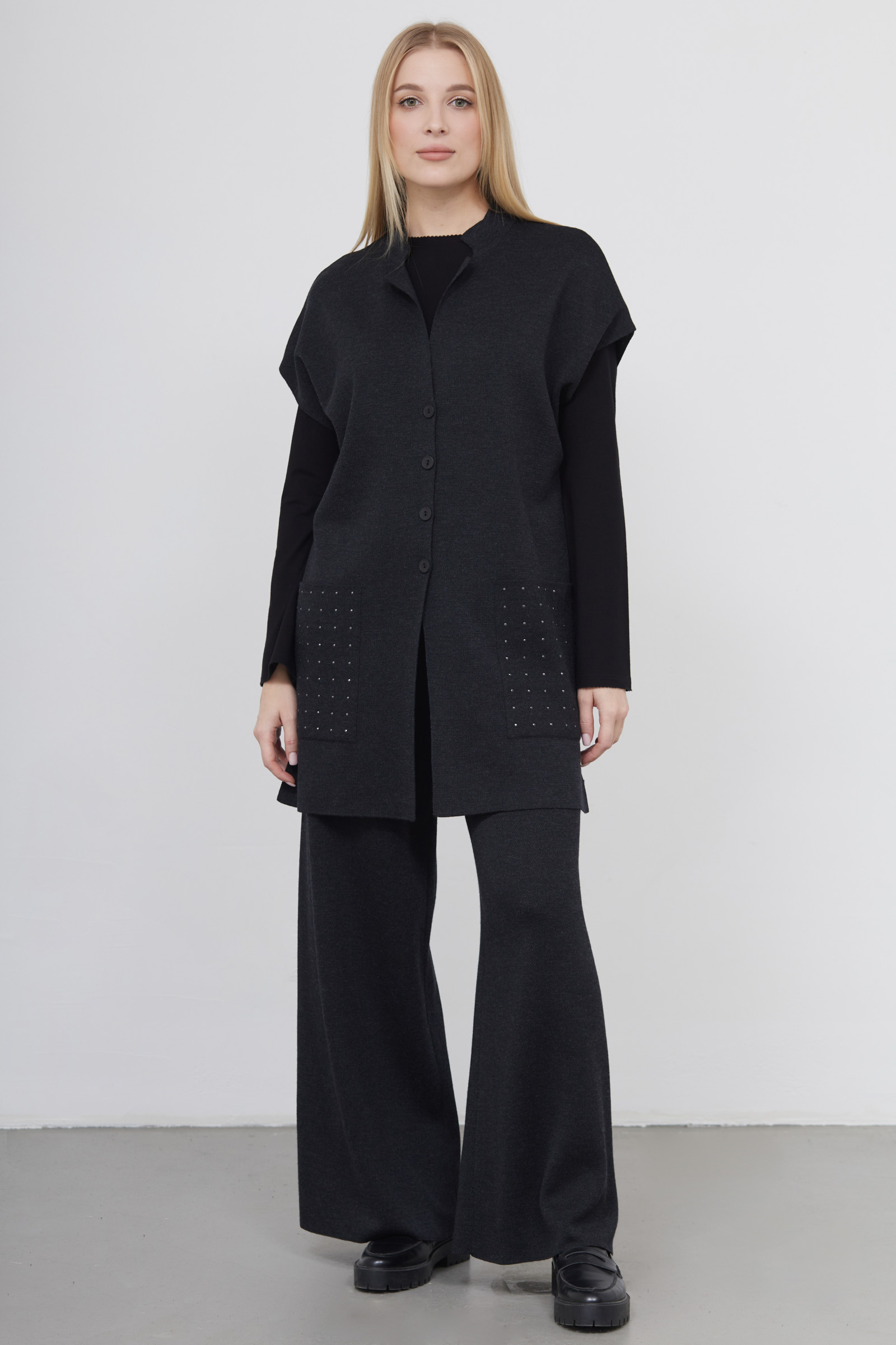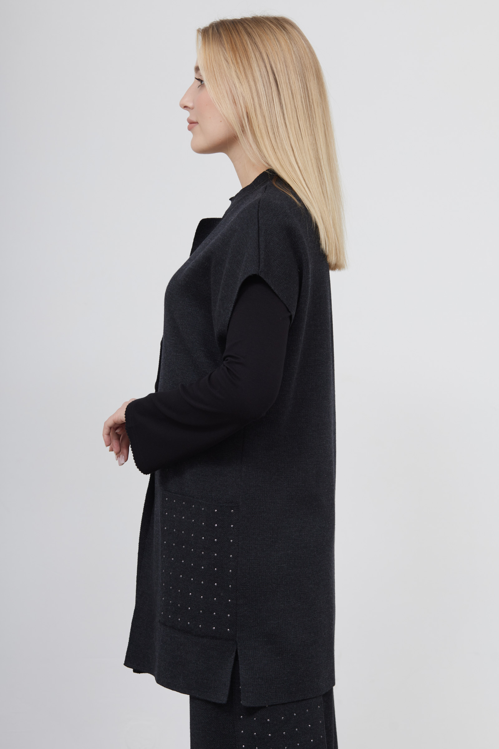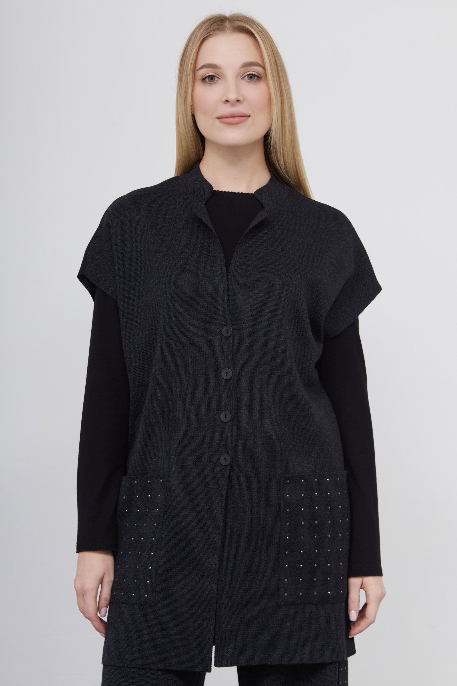 Длинный полушерстяной жилет oversize с декором на карманах.