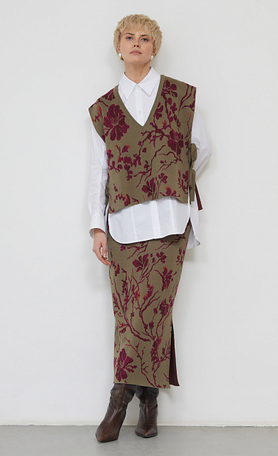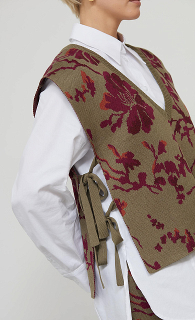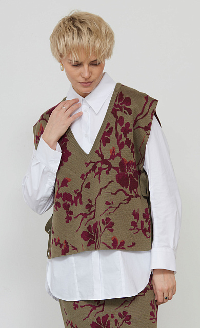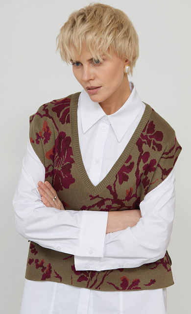 Слегка укороченный жилет жаккардовой вязки с контрастным фантазийным принтом.