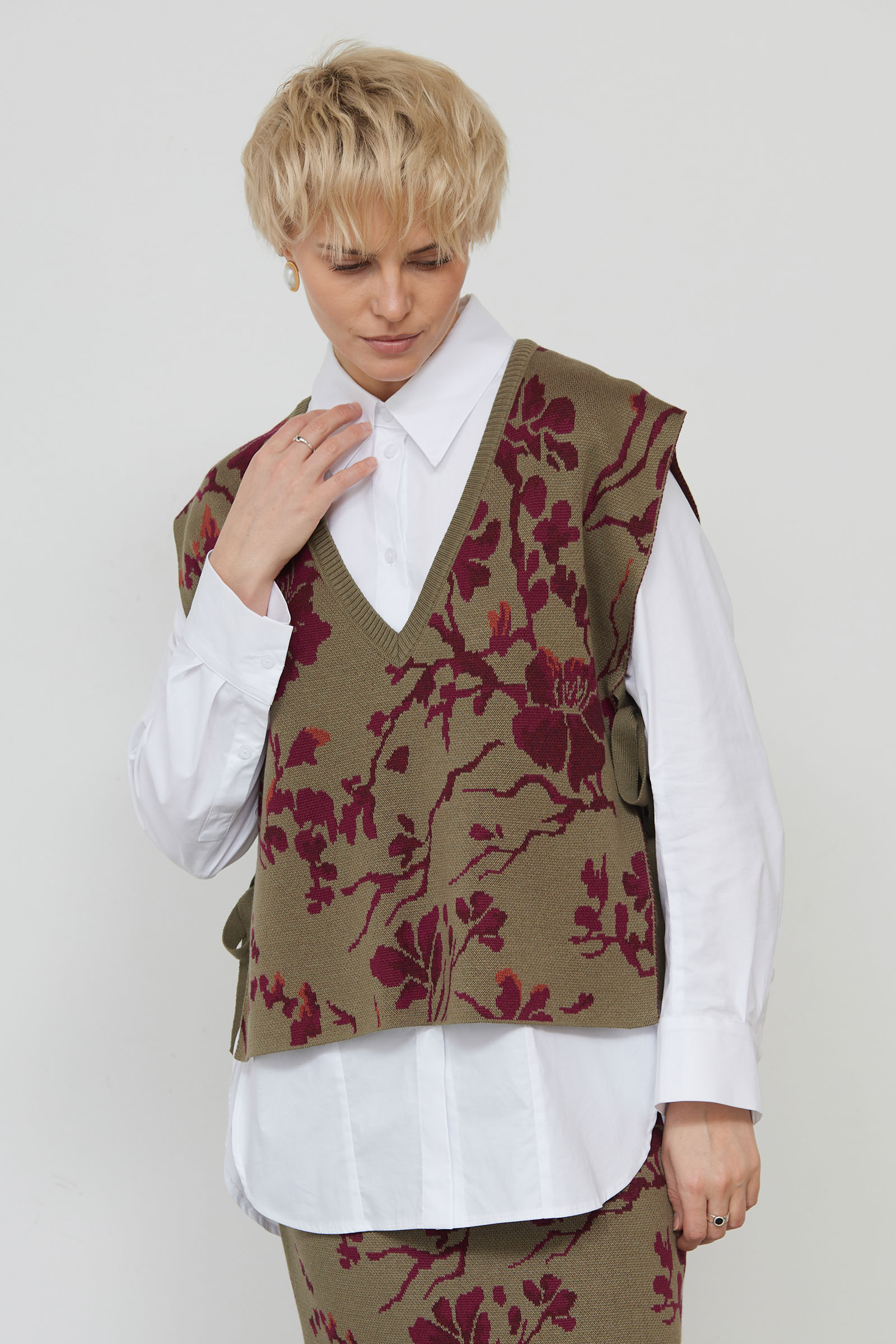 Жилет oversize из мягкого трикотажа жаккардовой вязки с завязками по бокам.