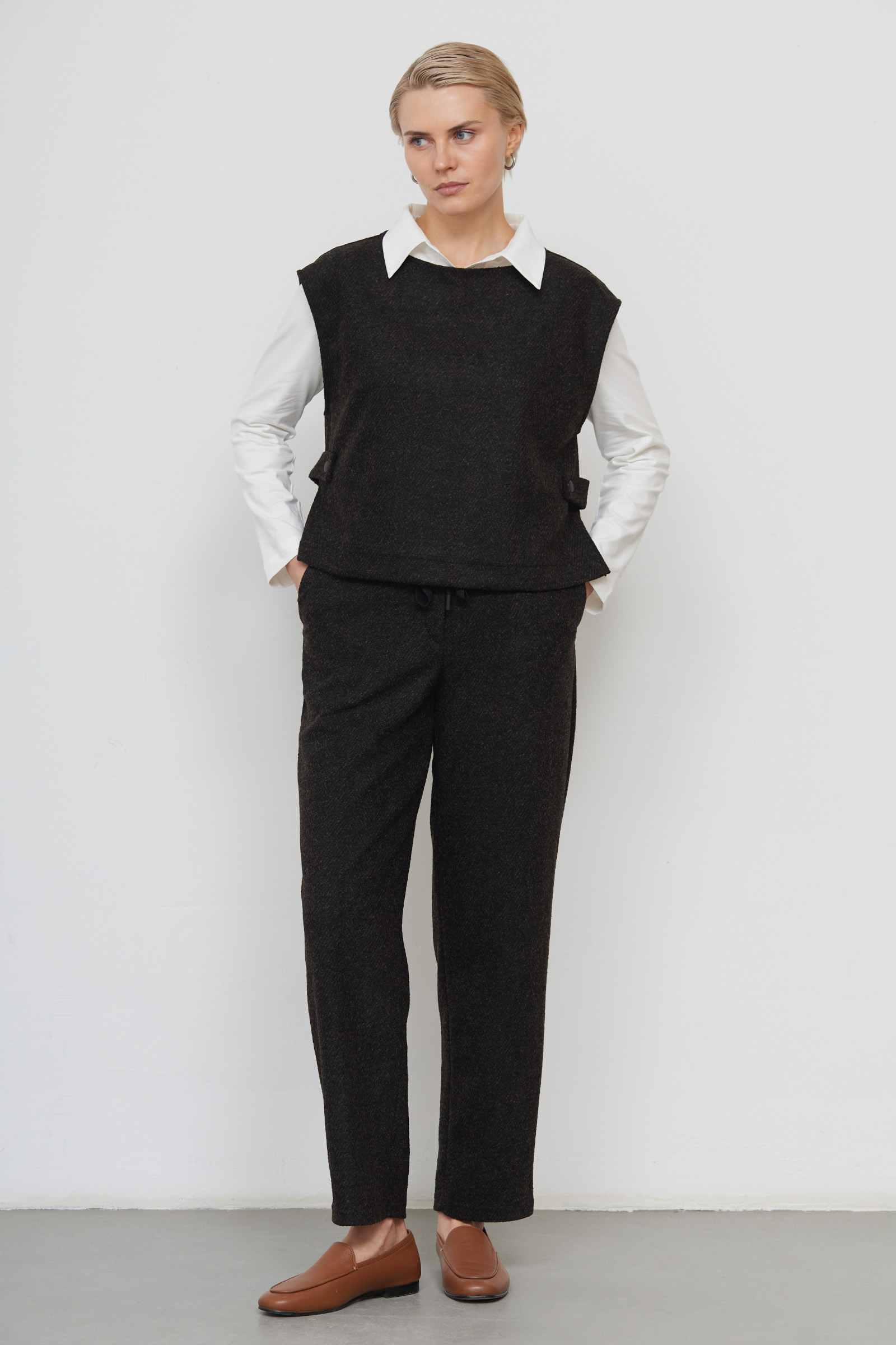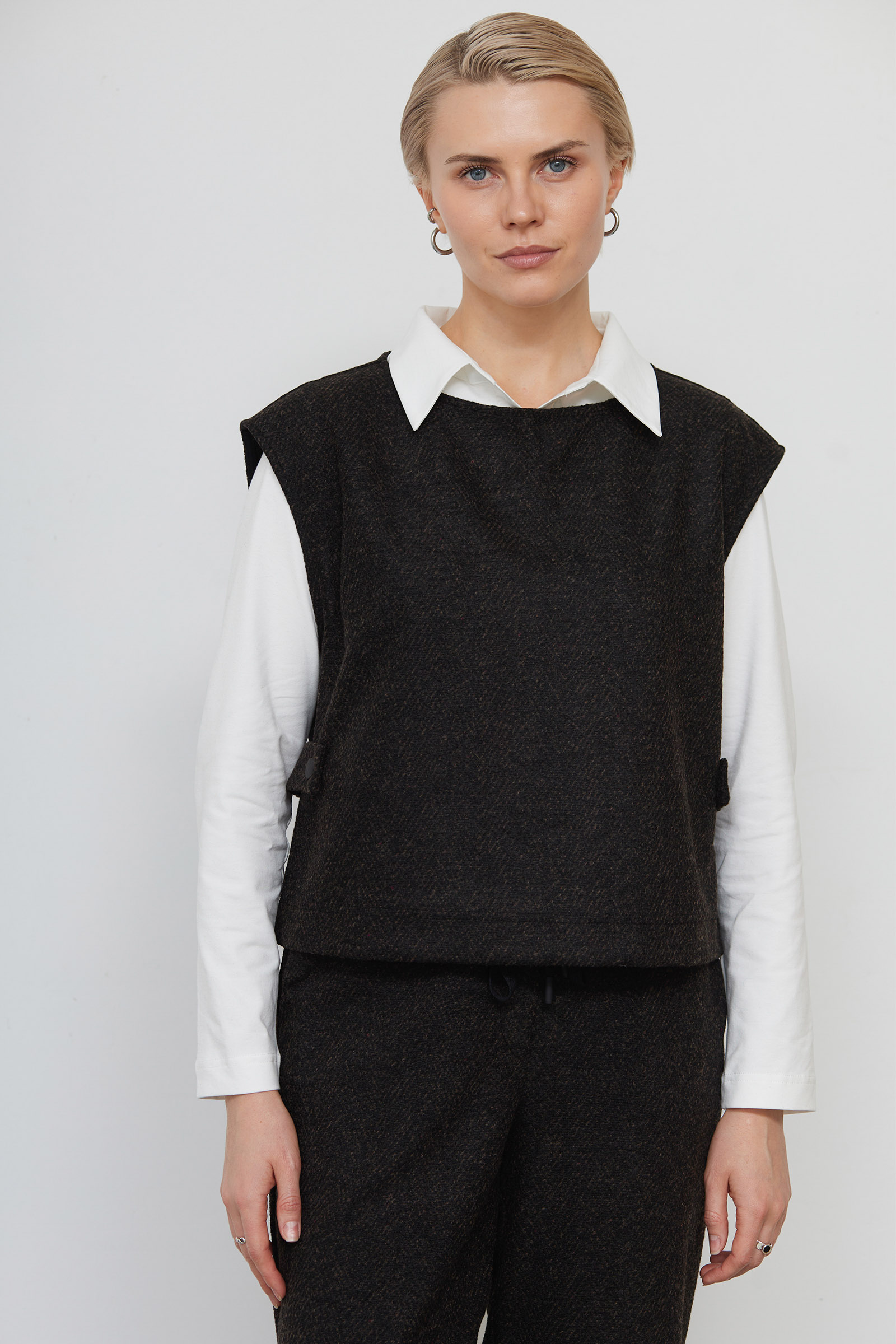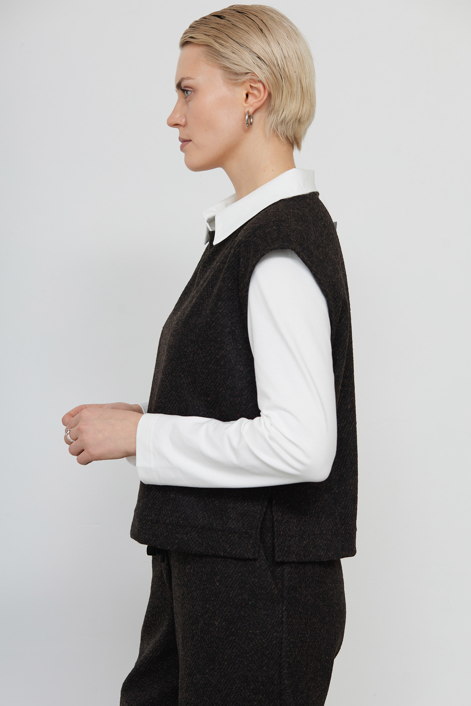 Жилет укороченный из костюмной ткани в елочку.
